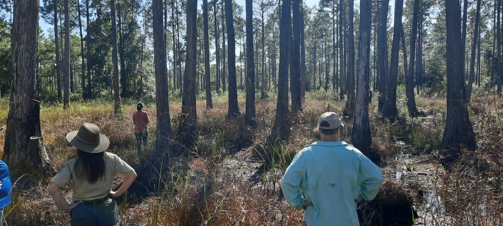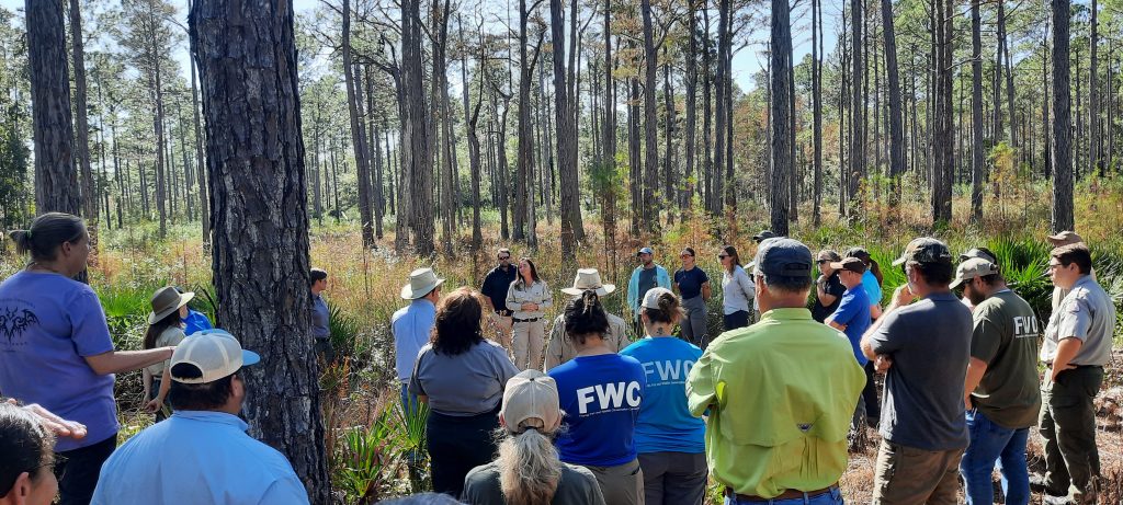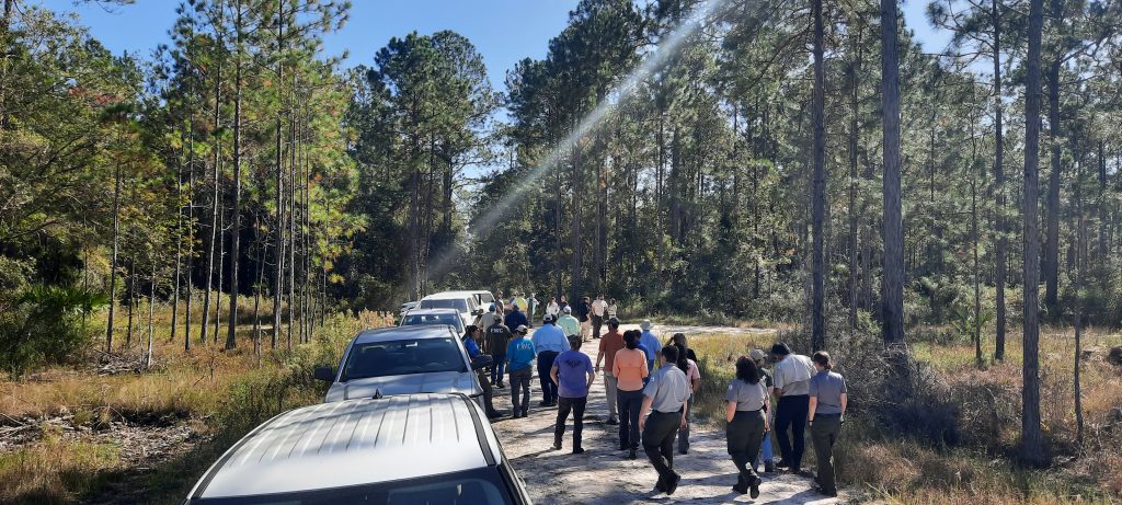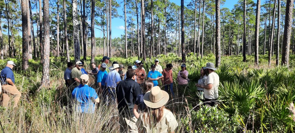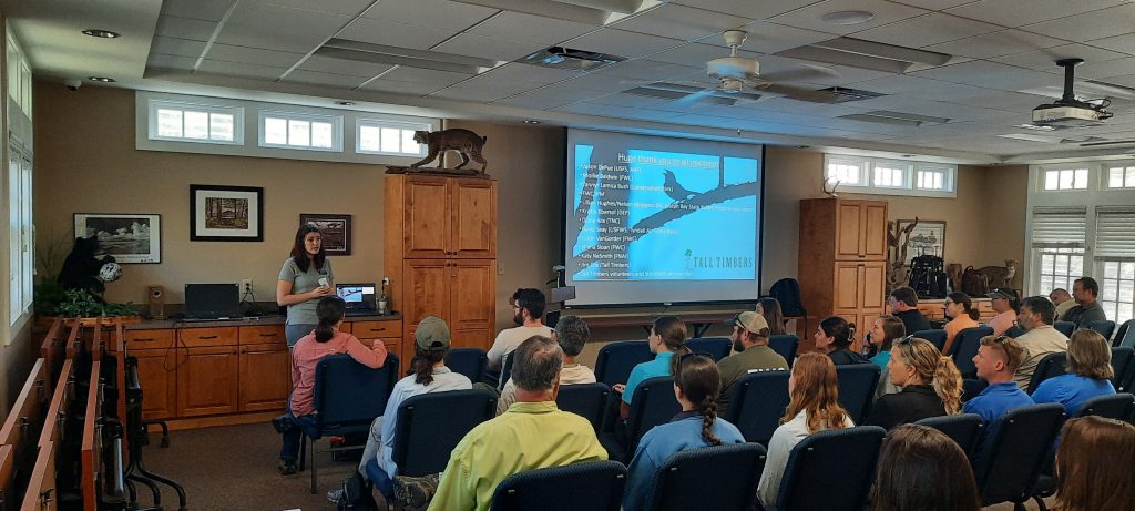 Representatives from multiple state and federal agencies, non-profit organizations, and private landowners gathered at the St. Marks National Wildlife Refuge to discuss pressing land conservation concerns. Kate Richardson, Jonathan Chandler, Amanda Bessler, and Josh Havird presented research and project reports on Bachman’s sparrows, frosted flatwood salamanders in St. Marks NWR and Apalachicola National Forest, and the use of drones on the National Wildlife Refuge. Following the presentations, Amanda and Logan gave attendees a tour of the preserve including a restoration site for the frosted flatwoods salamanders.